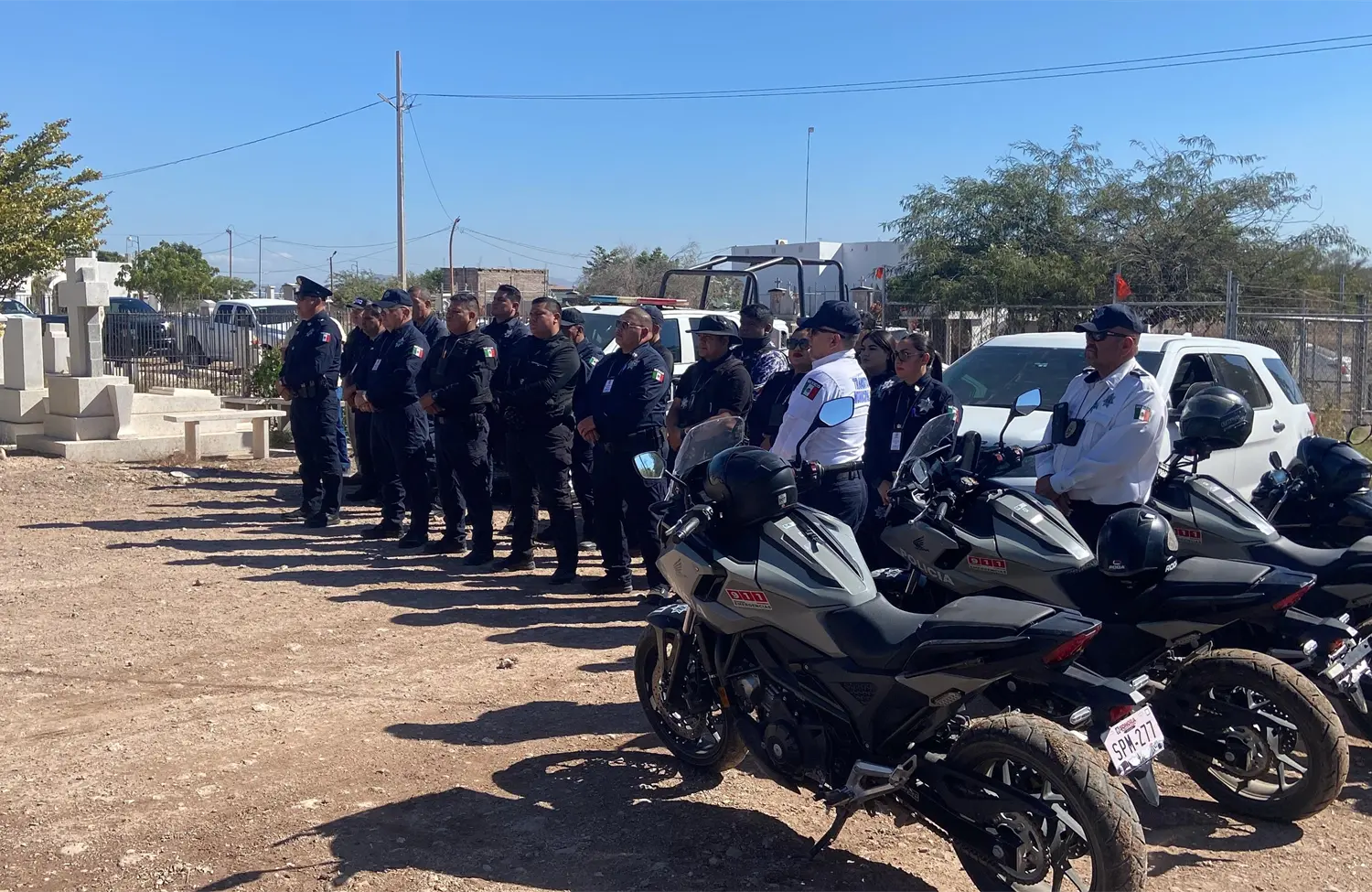 En el Panteón Jardín, el comisario de Seguridad Pública de Navojoa recordó a los elementos que han caído en el cumplimiento de su deber, y destacó que sus familias merecen un reconocimiento por la heroica labor de quienes entregaron su vida al servicio de la comunidad.
